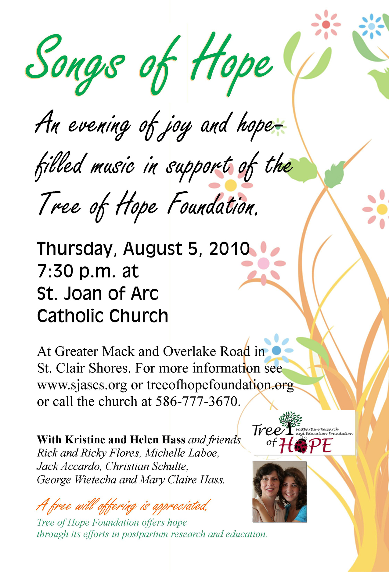 We’re holding a concert Songs of Hope at St. Joan of Arc at 7:30 on Aug. 5. We have some really talented folks with us. It’ll be cool. We’re singing mostly contemporary Christian music. All songs with hope at the theme.