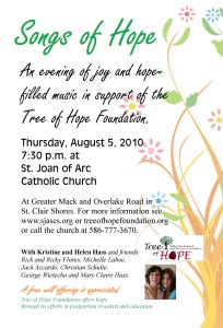 The Tree of Hope Foundation was conceived as a result of a tragedy. In 2005, a young mother in our parish took her own life and that of her five-week-old infant daughter as a result of a postpartum mood disorder. On the day of that tragic event, her family vowed they would do what they could to prevent that from happening again. They began the Tree of Hope Foundation which promotes research, education and awareness of postpartum-related mood disorders. Check out their site to learn more of the good work they are doing.