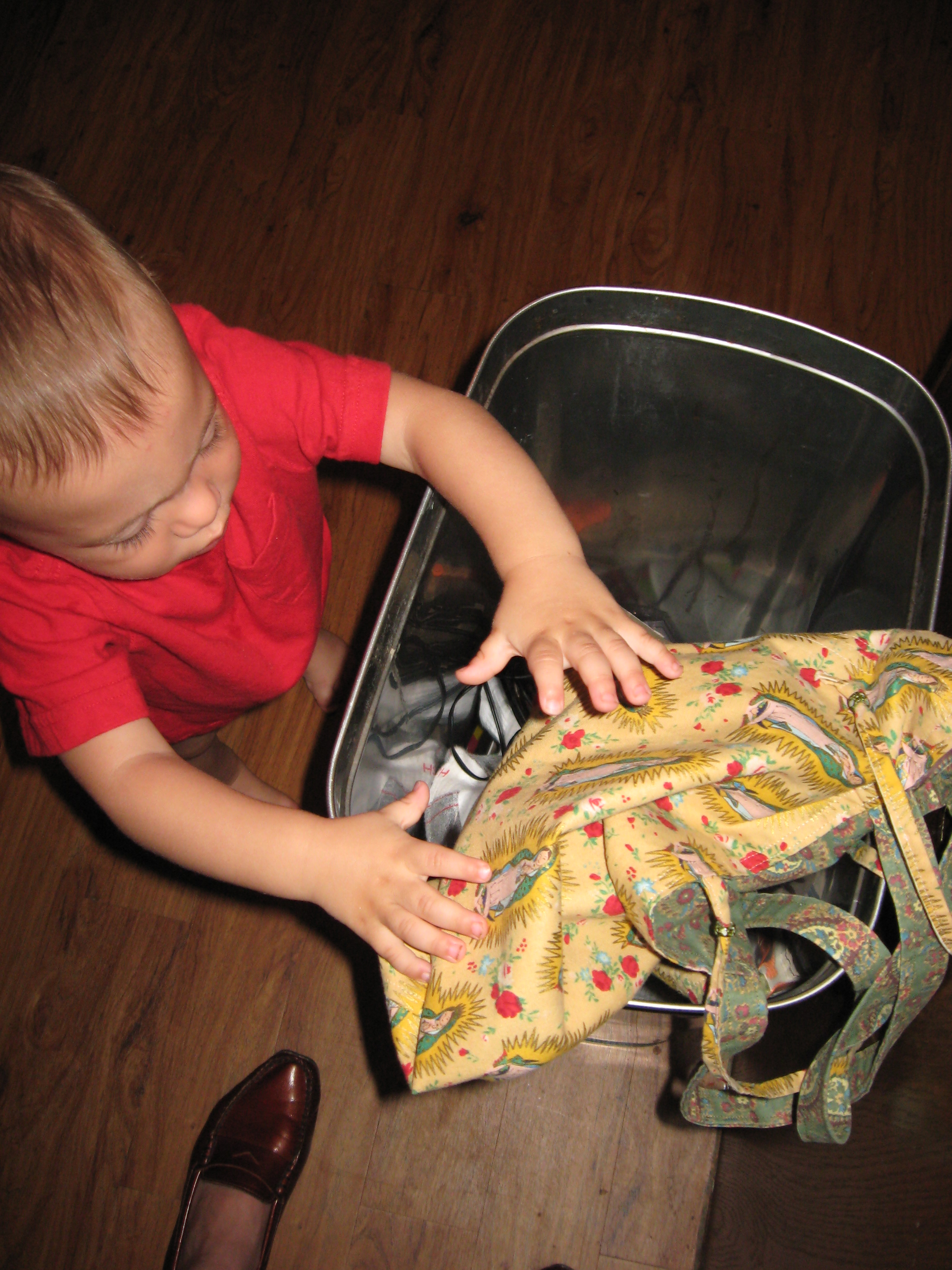 Following a four-day vacation away from home, the very first thing that baby boy did after walking in the door was seek out things he could throw away. We all have our comforts of home, apparently this is his.