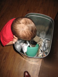 Clifford’s continued interest in the trash demonstrates that at16-months old, he does not lack perseverance. As I watch him hunting and seeking things to put in his beloved shiny can, or trying over again with the mop three times his height,  I can’t help but wonder how this will translate into the kind of little boy, then man,  he will become. (I like to imagine it means he will naturally gravitate toward cleanliness. I can dream, can’t I?)