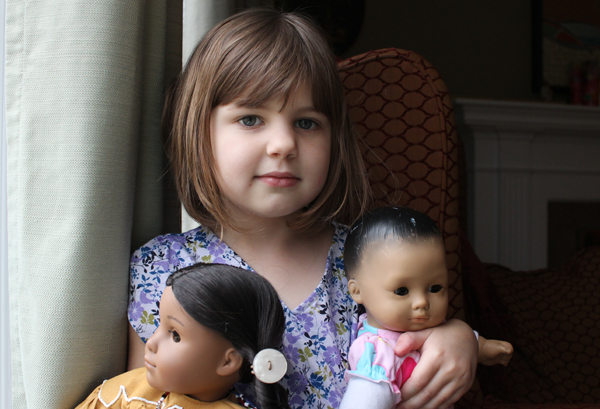 After a visit to the two first-grade classrooms in the school, we headed to the gym to check out the activities there. During our look around, Miss Blue Eyes looked up and me and informed me that we needed to go back up to the classrooms. She needed to meet the teachers again. And she needed to look around more. I could see her distress. It’s the same distress she has when she has trouble dressing her dolls, or Cliff destroys her carefully arranged menagerie. But — the big difference was — it was real. And I felt for her.